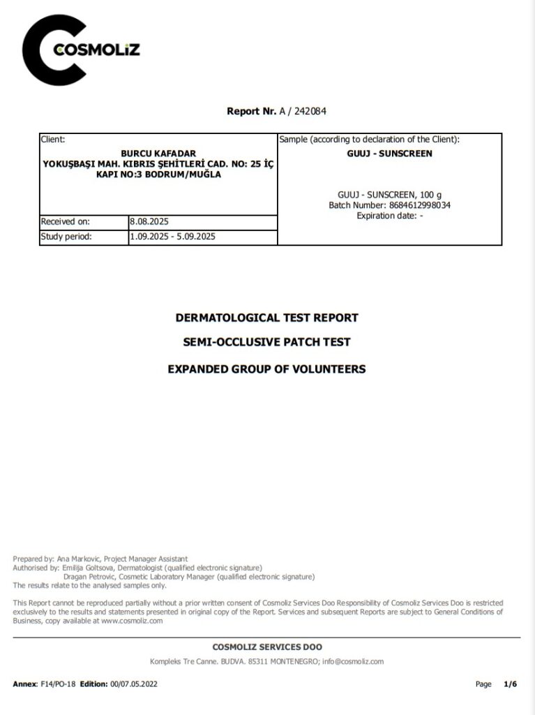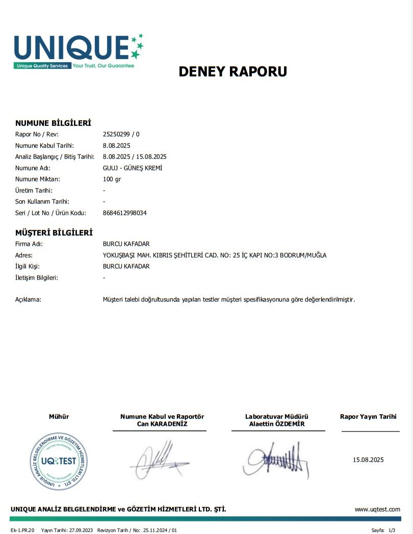 Cildin temizlenmesinden sonra uygulanabilecek ve cilt bakım etkisine sahip Guuj Güneş Kremi ihtiyacı karşılayan çok yönlü bir üründür. Yüksek koruma faktörü ile cildi zararlı ışınlara karşı korurken, formülündeki bileşenlerle cilt bakımına da destek olur
